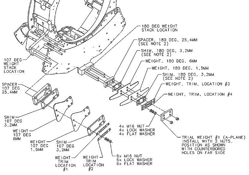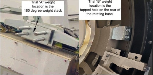 Trial weight A at 180° position must be installed over top of the existing weight stack nuts such that existing nuts are in recessed holes of trial weight. Install trial weight as shown in the Weight Diagram on the system. This is the configuration and weight components expected by the program.