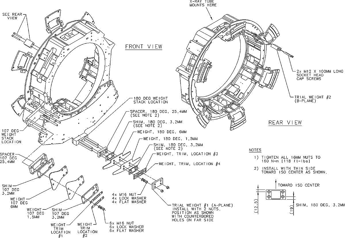 - If the sensitivity matrix does not exist or the gantry is out of balance, the program will ask you to enter the current weight configuration prior to performing the steps to generate a new sensitivity matrix. See Figure 4 for example of entries for 107° weight stack. The 180° weight stack appears in the same manner.note: There is a weight diagram available via the “Weight Diagram” button in the GUI. See Figure 2. The diagram shown on the product supersedes any listing in this procedure. Pay close attention to Note 2 for the 180° 25.4mm spacer and 3.2mm shim orientation. The holes are shifted to one side and should be installed with the holes closest to the edge on the bottom near the DAS.