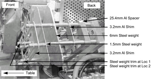 stack. The 180° weight stack appears in the same manner.note: There is a weight diagram available via the “Weight Diagram” button in the GUI. See Figure 2. The diagram shown on the product supersedes any listing in this procedure. Pay close attention to Note 2 for the 180° 25.4mm spacer and 3.2mm shim orientation. The holes are shifted to one side and should be installed with the holes closest to the edge on the bottom near the DAS.