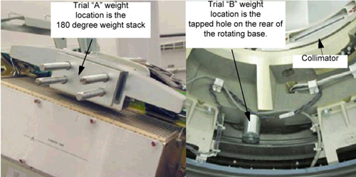 Trial weight A at 180° position must be installed over top of the existing weight stack nuts such that existing nuts are in recessed holes of trial weight. Install trial weight as shown in the Weight Diagram on the system. This is the configuration and weight components expected by the program.