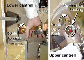 2. Disengage the locking mechanism on the upper cantrell brackets by using your thumb to slide the trigger (red lever) back. This will release the locking mechanism and allow the cantrell to be rotated upwards with steady and firm pressure.