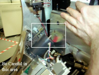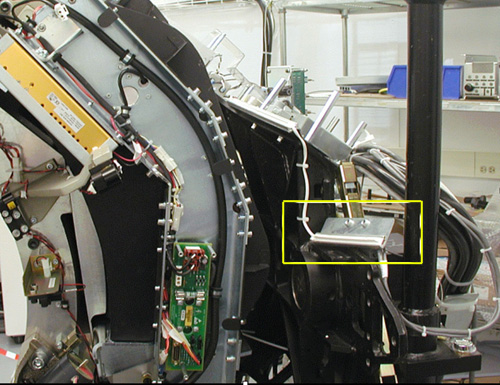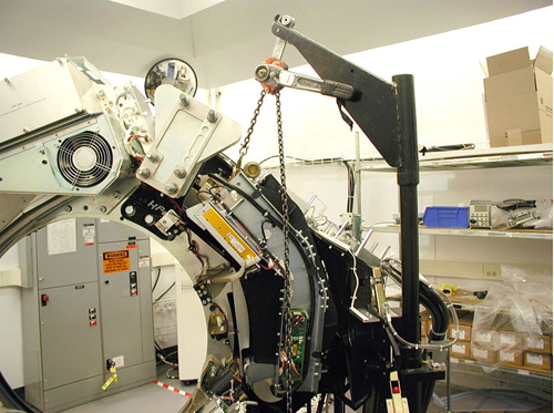 - Using hoist, swing new HX into place on the gantry. Be careful in the collimator motor area where it is possible to cut wires and damage other equipment. See Figure 6.