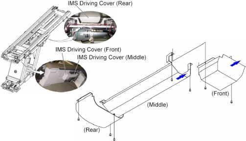 - Remove 3 screws holding the IMS Driving cover (Middle) to the Table, and slide it toward the Gantry, then remove it from the Table.