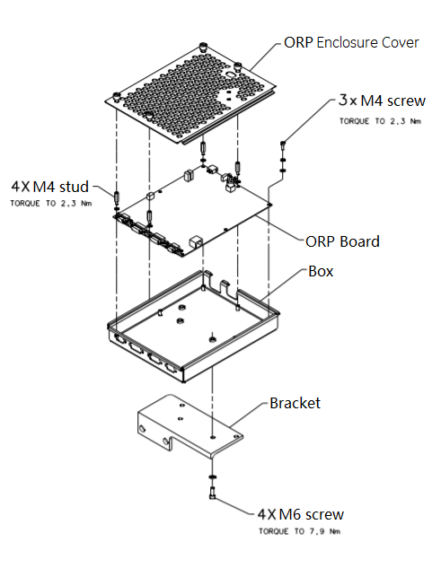 - Assemble the ORP enclosure with board to the bracket by using four M6 screws, apply torque to 7.9Nm.