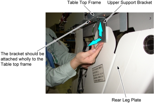 - Push up the upper support bracket of the front side plate against the Table top frame, and pull the upper support bracket way from the cover plate, then tighten the 2 screws of the upper support bracket of the front side plate.