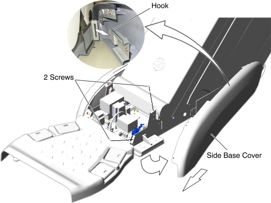 - Set the hook inside the side base cover to the Table bracket, and tighten the two screws.