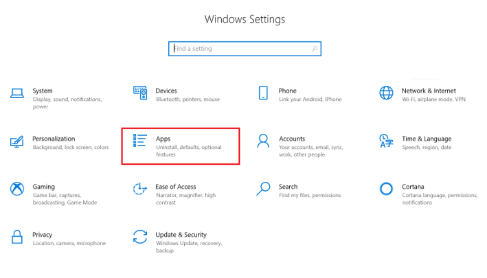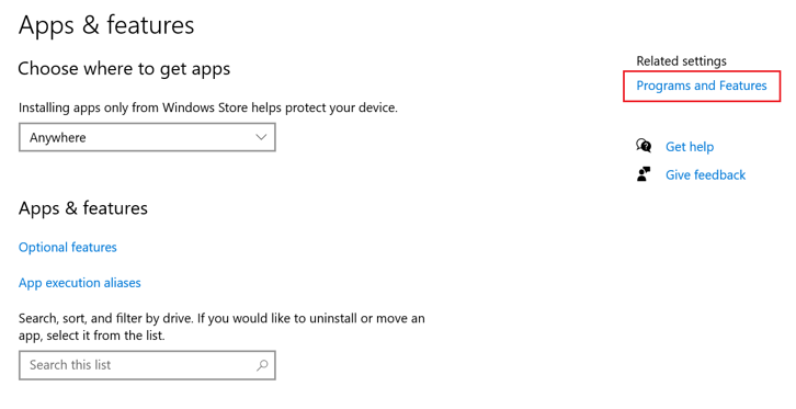 - Select Apps -> Programs and Features.