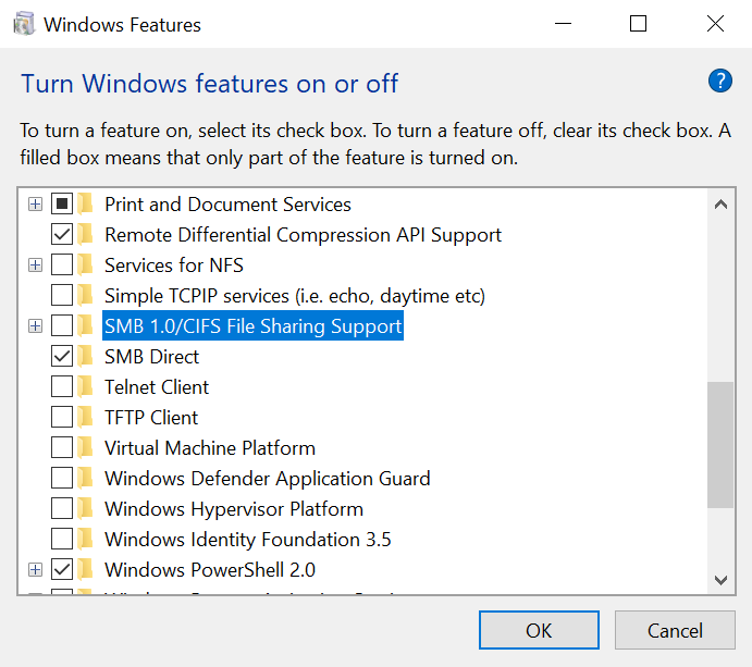 - Deselect check box SMB1.0/CIFS File Sharing Support, then click OK to wait windows reboot.