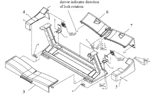 - Start with the rear covers (Shown as items 6 and 7). Using an 8 mm hex wrench twist the 3 twist locks counter-clockwise to release the locks and pull each cover out from the back of the gantry.
