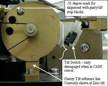 - Install new switch assembly and adjust to make sure the switch is disengaged in the cam cutout and engaged on the high edge of the cam. Gantry power will need to be restored to allow the gantry to tilt for this adjustment.