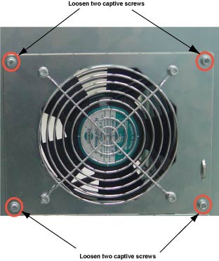 3. Remove the four (4) 4mm socket cap screws, nuts, and washers that hold the Fan to the mounting bracket. Save the screws and the fan guard.
