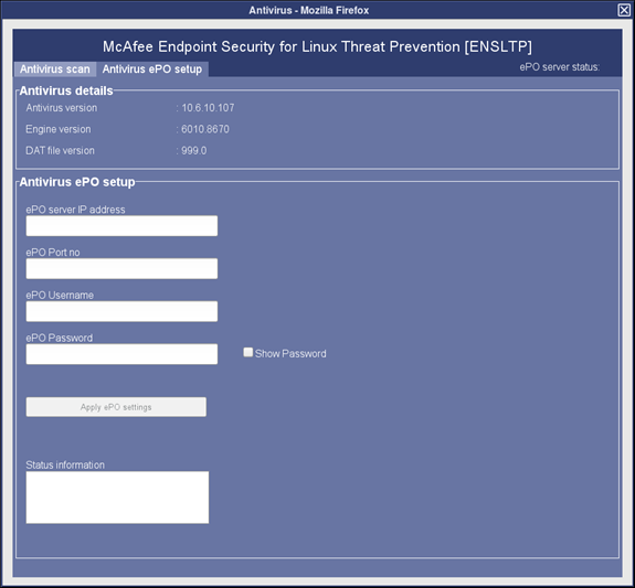 - Launch Antivirus UI from Security Center. Click on Antivirus EPO Setup Tab.