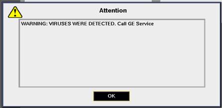 If any virus detected during anti-virus scan, then it will through attention pop-up with following message “WARNING: VIRUSES WERE DETECTED. Call GE Service”.