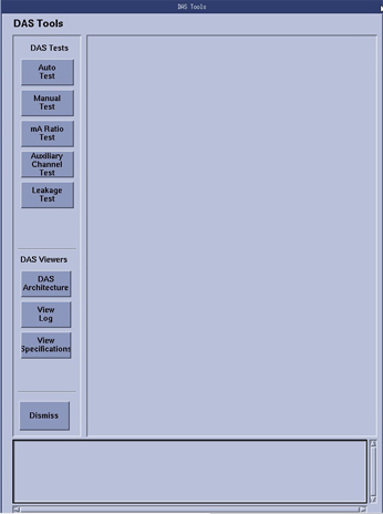 DAS Tool is both a tool and diagnostic used to test or exercise most or all functions of the DAS, to verify the performance in both a manufacturing and field service environment. There are several sub-tests within DAS Tools that are specifically used during system install/integration, while other tests are used for diagnostic purposes. There is also a section called “viewers,” which allows the user to view the DAS architecture relative to DAS to Detector channel mapping, View error log, and view the test specification limits for each test.
