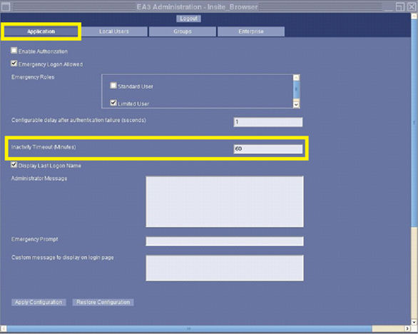 Figure 6. EA3 Admin Browser, Application Tab – Inactivity Timeout
