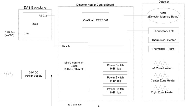 In order to obtain consistent and accurate results, the detector must be kept at a constant temperature. The DHCB system consists of a circuit board containing micro-controller based electronics and a memory device with serial interface. The heater is supplied power by the DHCB, while the DHCB gets power from the external 24V power supply.