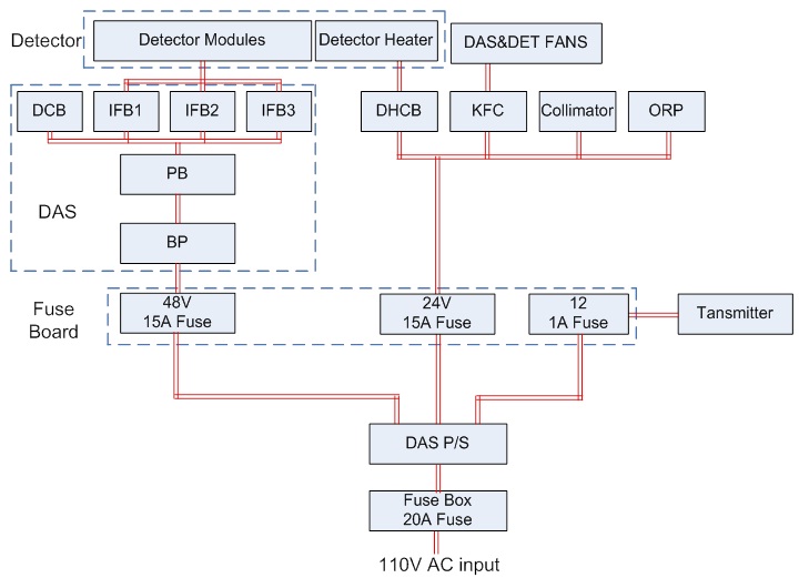 The DAS power supply can ouput 48V, 24V and 12V voltage. It’s used to power the DAS, Detector subsystem, Collimator, ORP, Detector Heater Control Board, Fan Controller Board (KFC) and Slip ring Transmitter. All voltages used by the DAS and Detector are generated via on isolated DC-DC converter on power board. The power is supplied by regulators on the DIFB's. Each DIFB can power on up to 20 detector modules. There are no voltage adjustments for the DAS components. The Power supply has an internal fan for cooling.
