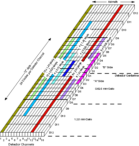 Detector Row: A detector consists of 24 diodes arranged in the “Z” direction. A row of 16 cells across all detector channels designated by Diode Number AND Side. (Ex. Detector Row D2, Side “A”).
