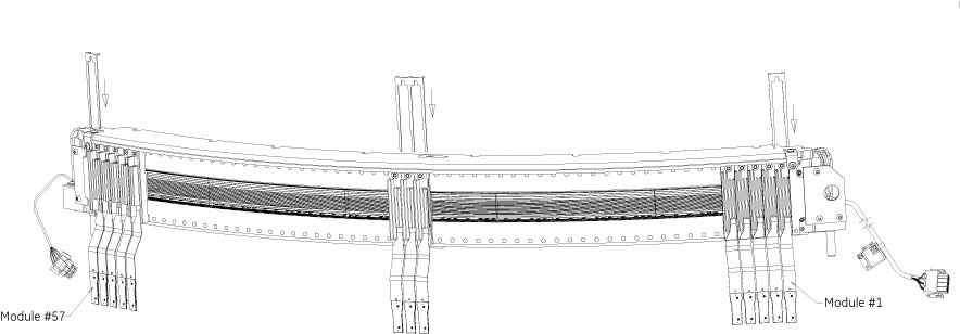 The detector assembly used on this system houses 57 Detector Modules (Figure 1). Each module has two sides (an A-side and a B-side) with twelve diodes or cells per channel per side. Cells are labeled A1/B1 through A12/B12, for a total of 24 rows across the detector face (both A and B sides). Note, there are sixteen (16) 0.625mm cells - eight (8) per side and eight (8) 1.25mm cells - four (4) per side. The 1.25mm cells comprise the four (4) outer rows on both A and B sides. Up to 24 rows per channel are active during any given data collection.