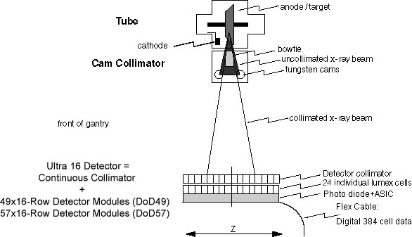 The detector is segmented into cells in the Z dimension. Post-patient collimation is provided by the segmentation of the detector cells, not by a separate post-patient collimator (see Figure 3). The post-patient collimation, along with summation of cells in the Z direction determines the Z-axis slice thickness of the scan data.