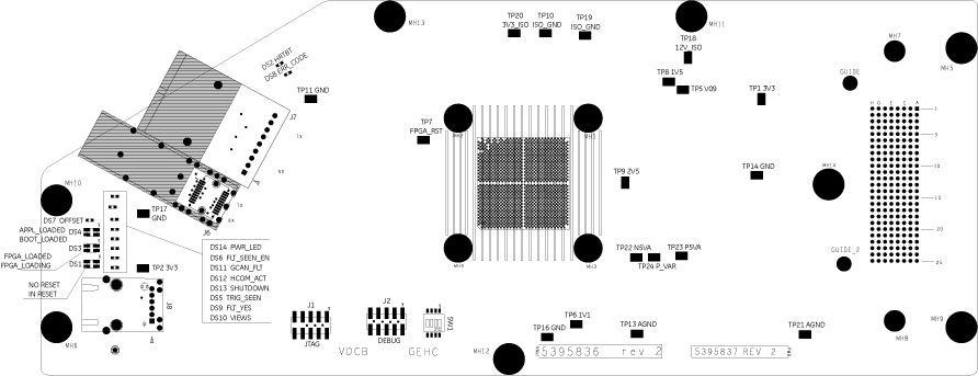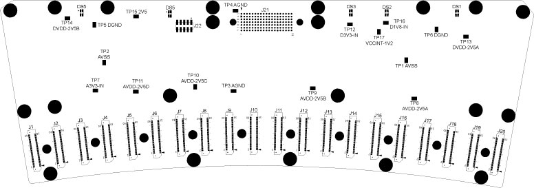 These are test points for 3.3V (analog input), 3.3V (digital input), 1.8V (digital input), 2.5V (analog for detector), 2.5V (digital for detector), 2.5V (digital for FPGA), 1.2V, analog ground and digital ground.
