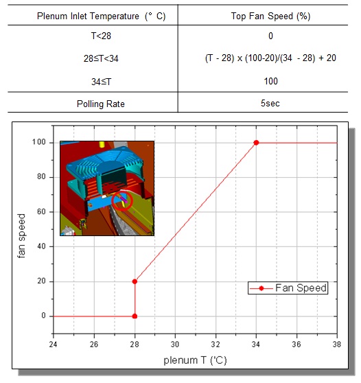 When average plenum inlet temperature less than 28oC, top fan will not run. The two top fans will run at full speed when the temperature value no less than 34oC. In the temperature range from 28 ~ 34oC, the top fan speed changing from 20% to 100% linearly.