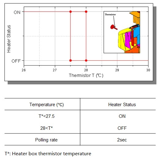 When the thermistor (in heater box) reading is higher than 28oC, the heater will be off.