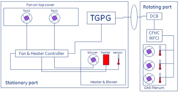 The schematics indicates the control and signal flow framework. The common fan controller (CFC) controls the top fan action based on the DAS plenum sensor’s average temperature value. TGP monitors the heater’s temperature and commands the CFC to control the heater’s action.