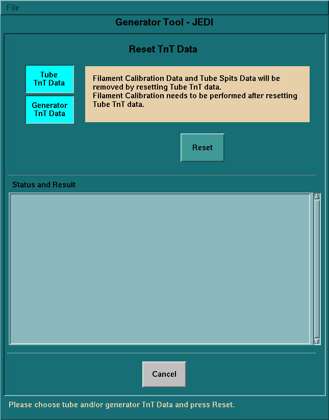 Use this tool to reset the Tracking and Trending data stored in the JEDI Generator. This tool can reset either the Tube or the Generator TnT data. To initiate the selected operation, press Reset.