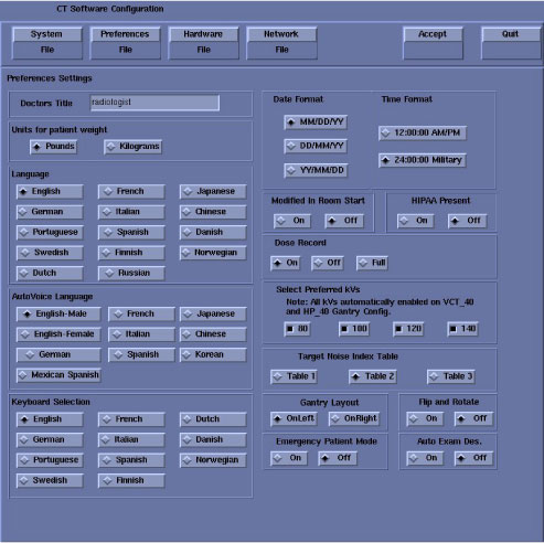 Select Gantry Layout. Configures the preference for patient loading. Choose correct orientation depending on site specific Gantry layout.