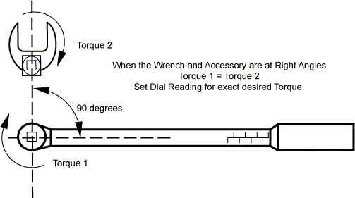 From this formula we can see that it is necessary to apply the force at a 90 degree angle to the axis of rotation to achieve accurate fastener torque. This same principle can be applied when using accessories with the torque wrench. See Figure 1 and Figure 2.