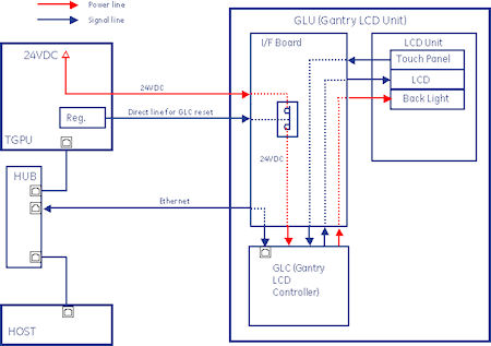 24VDC is supplied from TGPU to I/F board on GLU. I/F board bypasses 24VDC to GLC via SSR, that is open by GLC reset signal. GLC reset is actually done by Power on Reset. Every signals/powers for LCD unit is done via I/F Board. Also Ethernet connection is done via I/F Board.