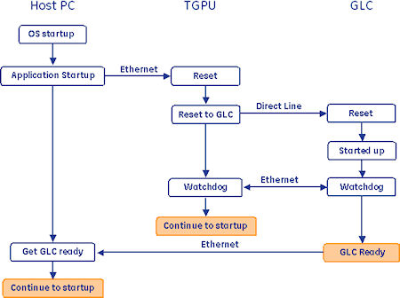 After OC power on, Host PC starts up OS loading, then Application starts up. At the timing, reset command is sent to TGPU via Ethernet, and TGPU will send reset signal via Direct line to GLC. After GLC has started up, GLC starts Watchdog Communication with TGPU. In normal communication path., GLC talks with Host PC.