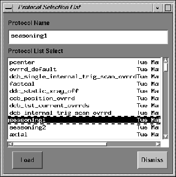When this button is selected, the Protocol Selection List pop-up window (see Figure 3) will appear. This list contains all the available protocols on the system. When the user selects a protocol for loading, the values of the scan parameters (that were stored in the protocol file) display in the appropriate areas of the screen.
