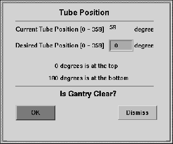 When this button is selected, the Tube Position pop-up window (see Figure 4) appears. The tube positioning function allows the user to position the tube between 0 and 360 degrees of the rotation.