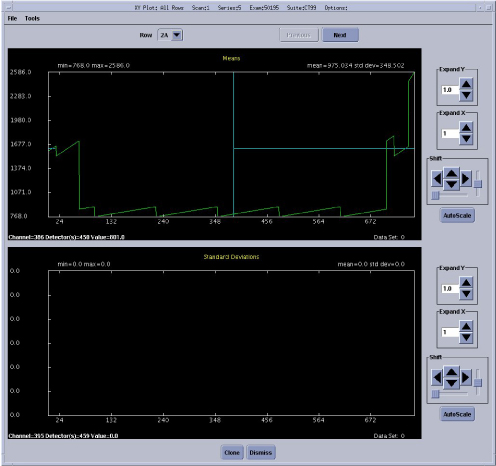 Data pattern test results for the IFB and DCB boards can be viewed using Scan Analysis. Note the Exam and series for the desired test to view in the result screen of the Scan Data Path GUI. The following example screens show the data patterns to be expected from each test. The data patterns shown are the View Vs Channels (VVC) plot of one channel using all default settings within Scan Analysis. All Channels will look the same.