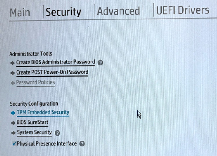 - Switch to Security tab and select TPM Embedded Security, then press Enter.