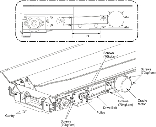 3. Slide the cradle motor away from the Gantry, and adjust position of the cradle motor to meet the ‘D’ recorded at Step 5.a, and fix the cradle motor.