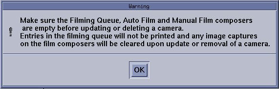 The Install Camera window appears, along with a warning message pop-up box, to remind you that all filming queues must be empty before you begin to update or delete a camera.
