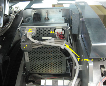 - Reconnect all cable connectors to the DHCB (J1, J2 and J3) and retie cables with tie-wraps.