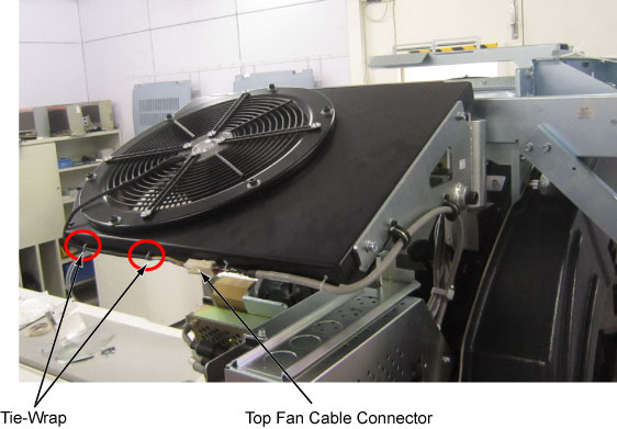 - Cut tie-wraps holding the top fan cable and disconnect the top