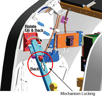 Disengage the locking mechanism on the upper cantrell brackets by using your thumb to slide the trigger (red lever) back. This will release the locking mechanism and allow the cantrell to be rotated upwards with steady and firm pressure.