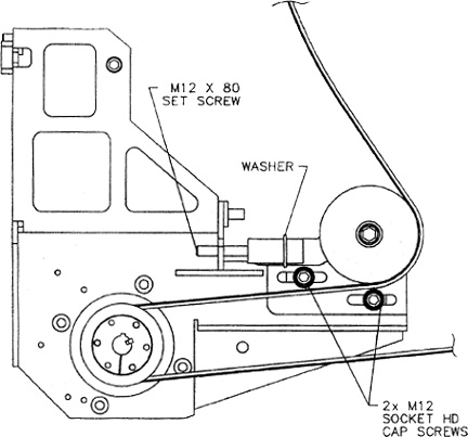 4. After you have gained access to the belt assembly, loosen the 2 -M12 socket head cap screws just enough to allow the pulley assembly to slide freely- left to right.