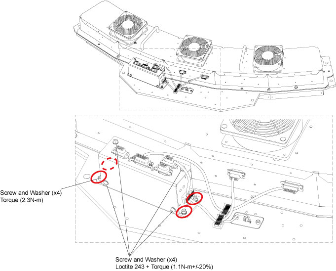 - Secure the KFC box bottom plate together with the fan controller board to the air filter and guide assy by using four screws and washers. (Loctite 243 and Torque: 1.1N-m +/- 20%)