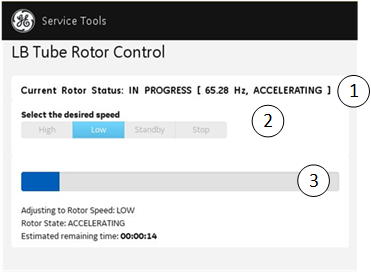 7. To start the rotor, open the LB Tube Rotor Control Tool (rotor management tool), select Idle, and then Run. Monitor the tool for the update that states the rotor has reached speed.