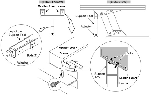 - Attach the support tool to the undersurface of the Table on the side farthest from the Gantry using the four bolts currently screwed into the bottom of the Middle Cover frame. Lower the Table onto the support.