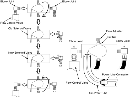 - Install the new solenoid valve assy to the elbow joint on the flow control valve.
