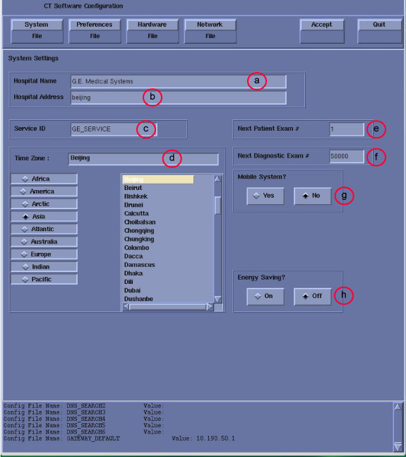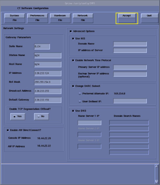 note: This screen provides the ability to declare the CT system on a hospital network. Key information such as Host Name, IP Address, Net Mask (for CT systems on a subnet) must be obtained from the hospital network administrator. - Configure Network Settings.