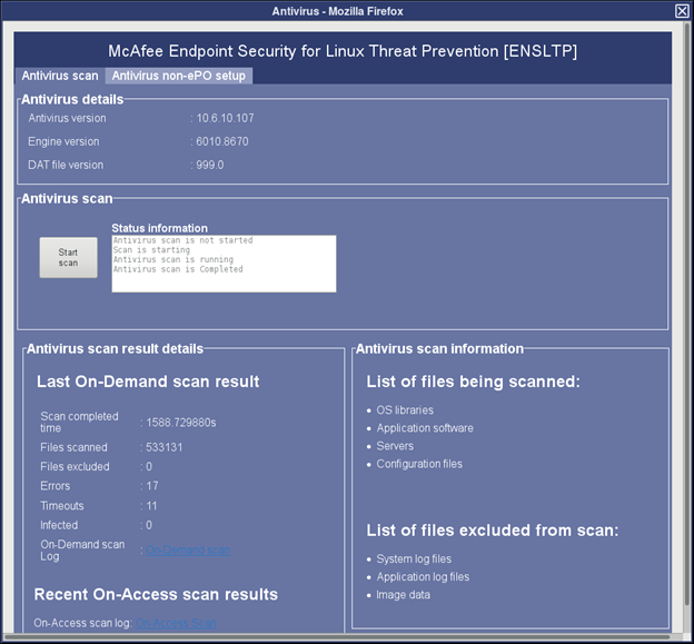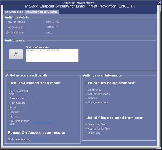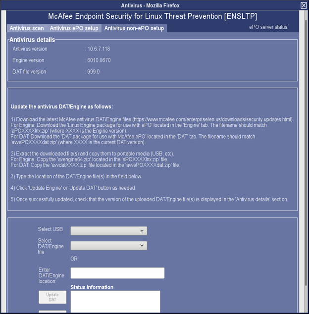 When ePO Server is configured, Virus signature database (DAT) should be updated or scheduled using ePO. Virus scans should also be scheduled from the ePO Server