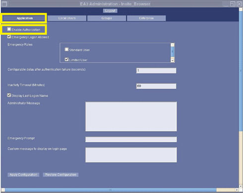 The last tab on the EA3 Admin Browser is the Enterprise tab. On this tab, you can configure the properties necessary to make a connection to an Enterprise directory server (i.e. MSAD, Novell, etc.). The Enterprise Tab is used by the site’s IT (Information Technology) and/or GE Service personnel. It provides connectivity to the site’s remote user database. If you do not have a network established in your hospital or clinic, this tab will not be used. Be prepared to assist the Customer with configuring the system to use the Enterprise Server feature. A detailed explanation and instructions on configuring the Enterprise Tab can be found in the System’s User or Learning and Reference Guide Manuals.